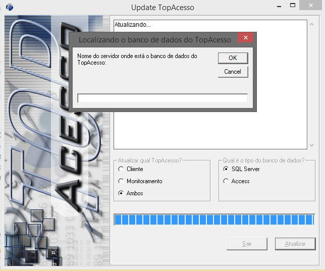 Ao atualizar a base do TopAcesso em SQL é solicitado o caminho do servidor do banco de dados, mas após informar o caminho e confirmar a mesma mensagem é exibida infinitamente conforme imagem abaixo: