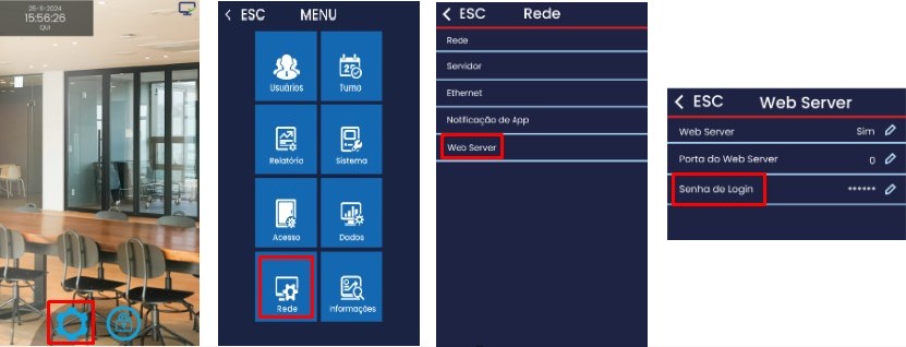 É possível alterar a senha do Webserver do leitor facial seguindo os seguintes passos no equipamento: Acessar o Menu do leitor facial > Selecionar a opção “Rede” > Web Server > Apertar em “Senha de Login” para alterar.