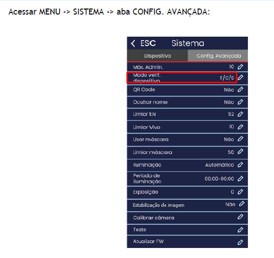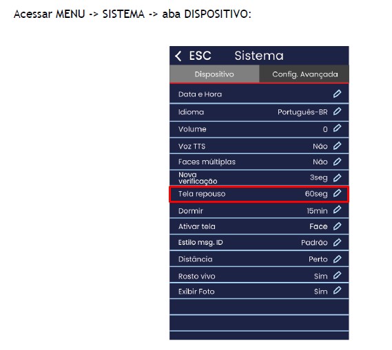 As configurações a seguir atende para cenário de reconhecimento utilizando a face (F) com instrução de tempo de repouso de tela.