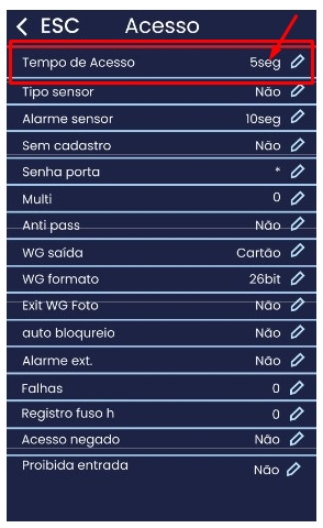 O tempo de acionamento de giro da catraca Easy é definido no Leitor Facial. Para alterar é necessário no Leitor Facial acessar as configurações da aba “Acesso > Tempo de Acesso” e definir o valor desejado: