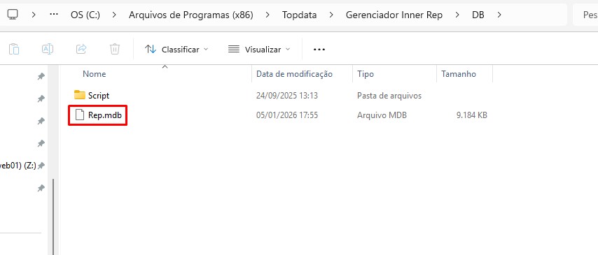 Caso a base esteja em Access, você poderá realizar uma cópia do arquivo com extensão .mdb que se encontra por padrão do caminho C:\Program Files (x86)\Topdata\Gerenciador Inner Rep\DB.