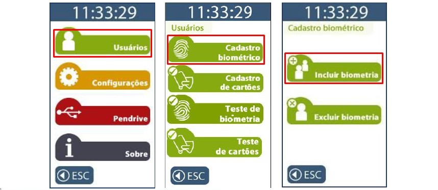 Para cadastrar uma biometria no Inner REP Plus, devemos acessa o “Menu” na tela do relógio e acessar o caminho abaixo: