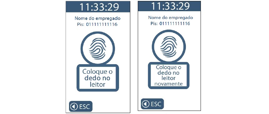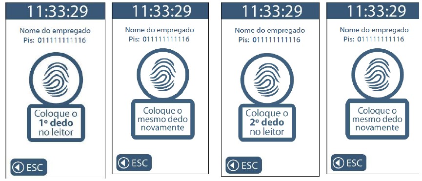 Depois de confirmar o número de cartão ou PIS/CPF do funcionário, o relógio pedirá para colocar o dedo no leitor. O Inner Rep Plus LFD no momento do cadastro solicitará a colocação do mesmo dedo duas vezes, ou seja, o MESMO dedo do usuário deve ser colocado no leitor biométrico duas vezes, para o cadastro da impressão digital. O usuário deve colocar o dedo que será cadastrado.
