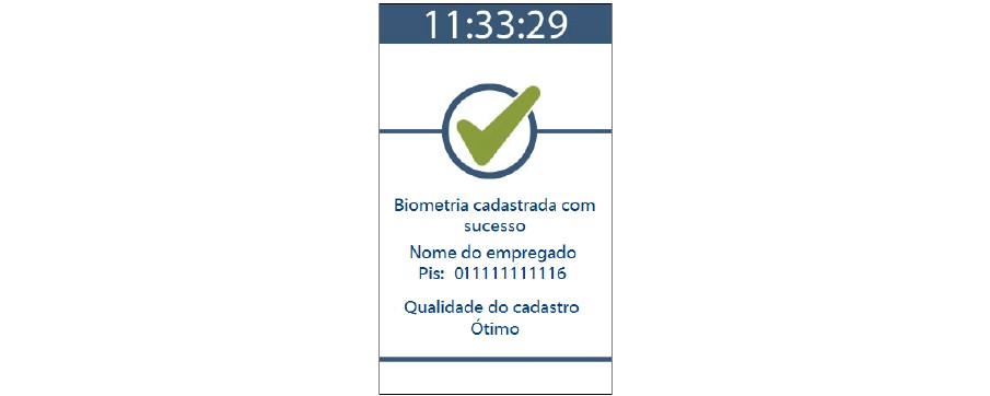 Será apresentada uma tela de confirmação da inclusão da biometria com sucesso. Observe a qualidade do cadastro. Uma digital somente será cadastrada com sucesso se o cadastro for “Bom” ou “Ótimo”: