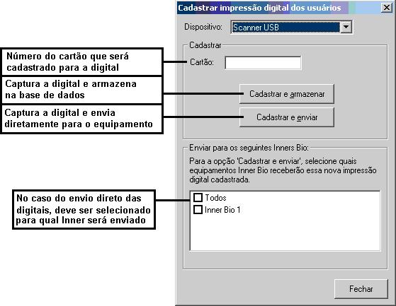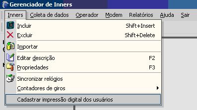 O cadastro das impressões digitais também pode ser feito em um dispositivo conectado ao computador e depois enviado aos Inners através do software Gerenciador de Inners. Para fazer isso é necessário o uso de um leitor de digital portátil (Hamster) comercializado pela Topdata. Este é ligado ao computador por uma porta USB e faz a leitura da impressão digital do usuário. Assim, estas digitais podem ser armazenadas na base de dados ou enviadas diretamente ao Inner. Para utilizar esta opção, deve utilizar o menu “Inner” – > “Cadastrar impressão digital dos usuários”.