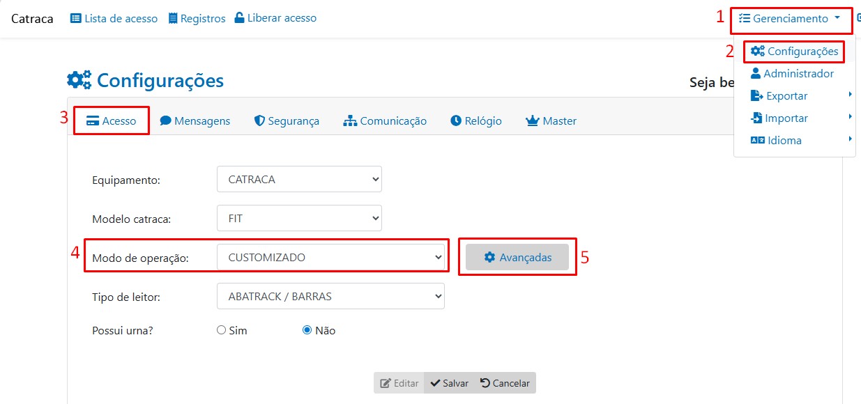 Primeiramente devemos acessar no webserver o caminho: Gerenciamento > configurações > Acesso > Modo de operação: Customizado > Avançadas, conforme imagem abaixo: