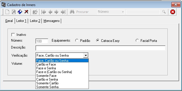 A configuração é realizada em Cadastros> Inners> Geral. A opção “Verificação” será exibida assim que “Catraca Easy” ou “Facial Porta” forem selecionados.