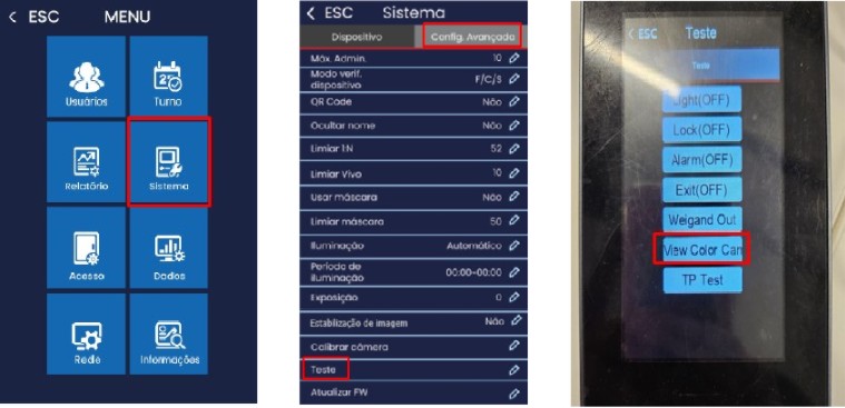 Para desabilitar a câmera infra vermelho do leitor facial acessar o Menu do leitor facial > Sistema > Config. Avançadas > Teste > View Color Cam, conforme mostra imagens abaixo: