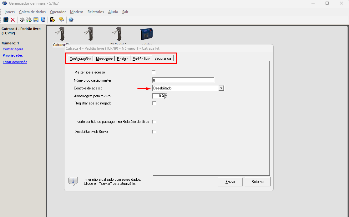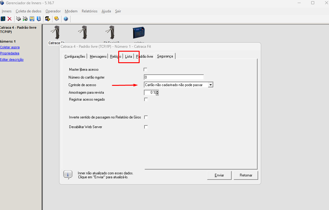 Para adicionar e habilitar a aba Lista, selecione o Inner (Catraca ou Coletor) e vá em propriedades ao abrir selecione a aba Segurança e altere a opção Controle de acesso para Cartão não cadastrado não pode passar ou Cartão não cadastrado pode passar em seguida será exibido a aba Lista para utilização.