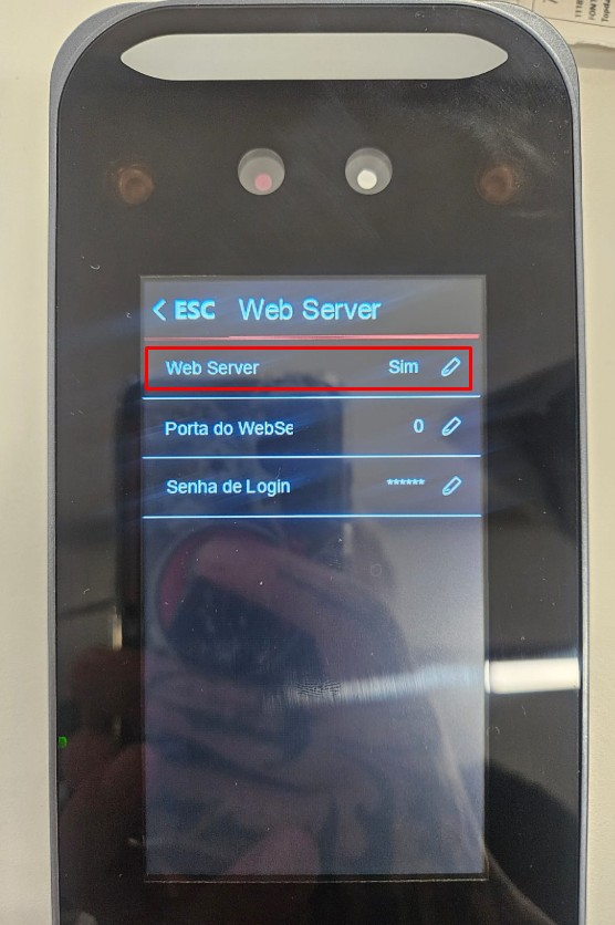 Para habilitar ou desabilitar o webserver no leitor facial, deve acessar o menu do leitor facial, clicando no ícone de engrenagem na tela principal e acessar a opção rede > Web Server. Ao selecionar a opção Web server nesta tela, terá a opção de deixar em “sim” ou “não”.
