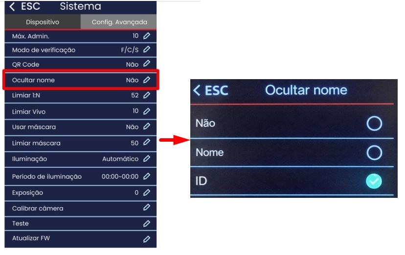 Ao acessar o menu “Sistema> Config. Avançadas” existe a opção “Ocultar nome” onde é possível definir como “não” pra não ocultar dados, “nome”, “ID” ou “Todos” de acordo com a necessidade:
