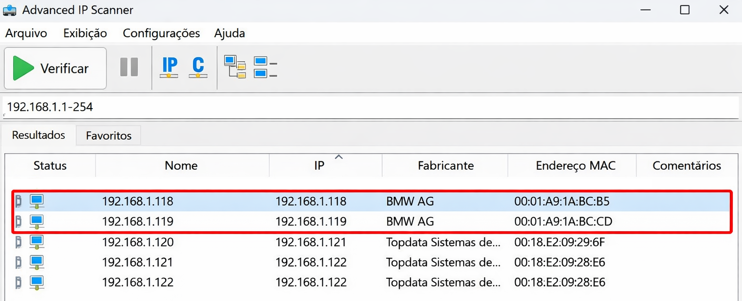 Como os Leitores faciais são identificados pelo Advanced IP Scanner? Os leitores faciais no Advanced IP Scanner são identificados como “BMW AG”: Esse artigo foi útil? Sim Não Artigos relacionados Como alterar Modo de ativação do Leitor facial e tempo tela de Repouso É possível conectar o Leitor Facial F4+ a redes Wi-Fi 5GHz? Como ocultar Nome e ID nos acessos feitos pelo Leitor Facial F4 É possível conectar o leitor facial F4+ em uma rede Wi-Fi oculta? É possível conectar o Leitor Facial F4+ em redes Wi-Fi ocultas? O leitor facial atualiza data e hora de forma automática(Network Time Protocol -NTP)?