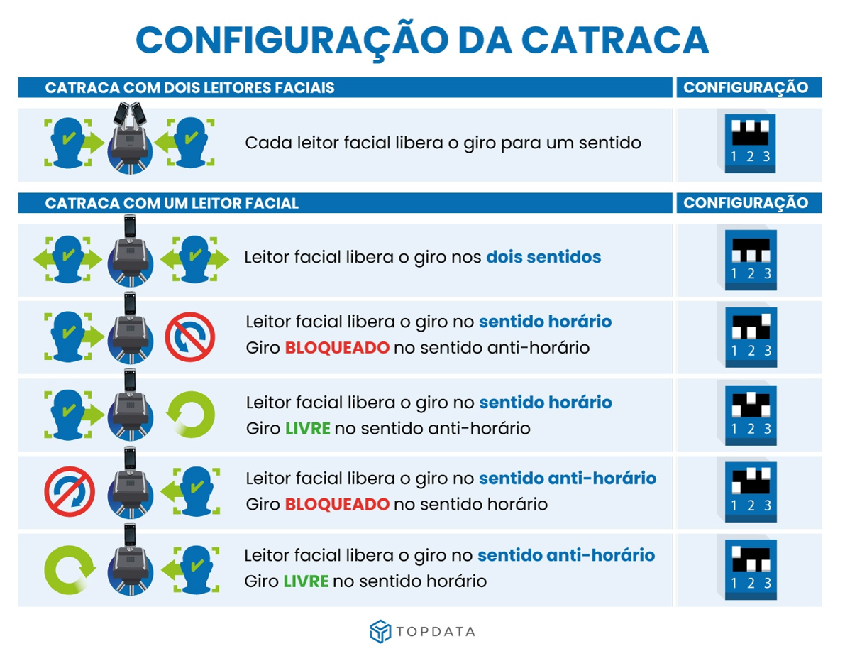 O sentido de liberação do acesso na Catraca Easy é definido através da configuração feita através de uma chave DIP switch presente na placa interna.
