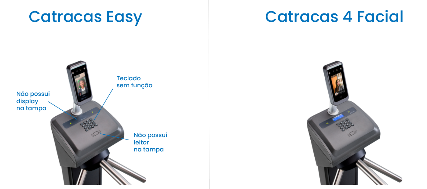 •Na Catraca 4 é possível instalar leitor biométrico, proximidade e QR Code na tampa, enquanto a Catraca Easy possui apenas o leitor facial, que tem um leitor de proximidade embutido.