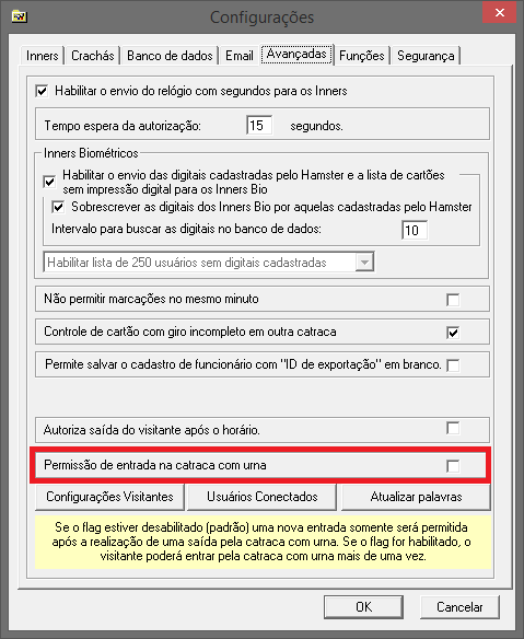 Após isso o visitante poderá realizar a entrada mais de uma vez em catracas com urna, com a opção desmarcada não é possível efetuar uma segunda entrada ao aproximar o cartão do leitor 1 será apresentada a mensagem “Acesso Negado” e o Debug vai apresentar o evento “ACESSO_NEG: O visitante está efetuando uma entrada, porém esta já foi registrada anteriormente”.