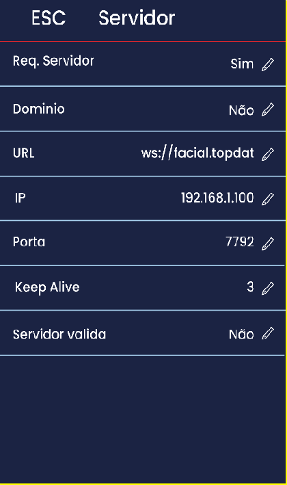 A configuração SERVIDOR define e habilita a comunicação do Leitor Facial com o computador central (Servidor) onde o software gerenciador está instalado.