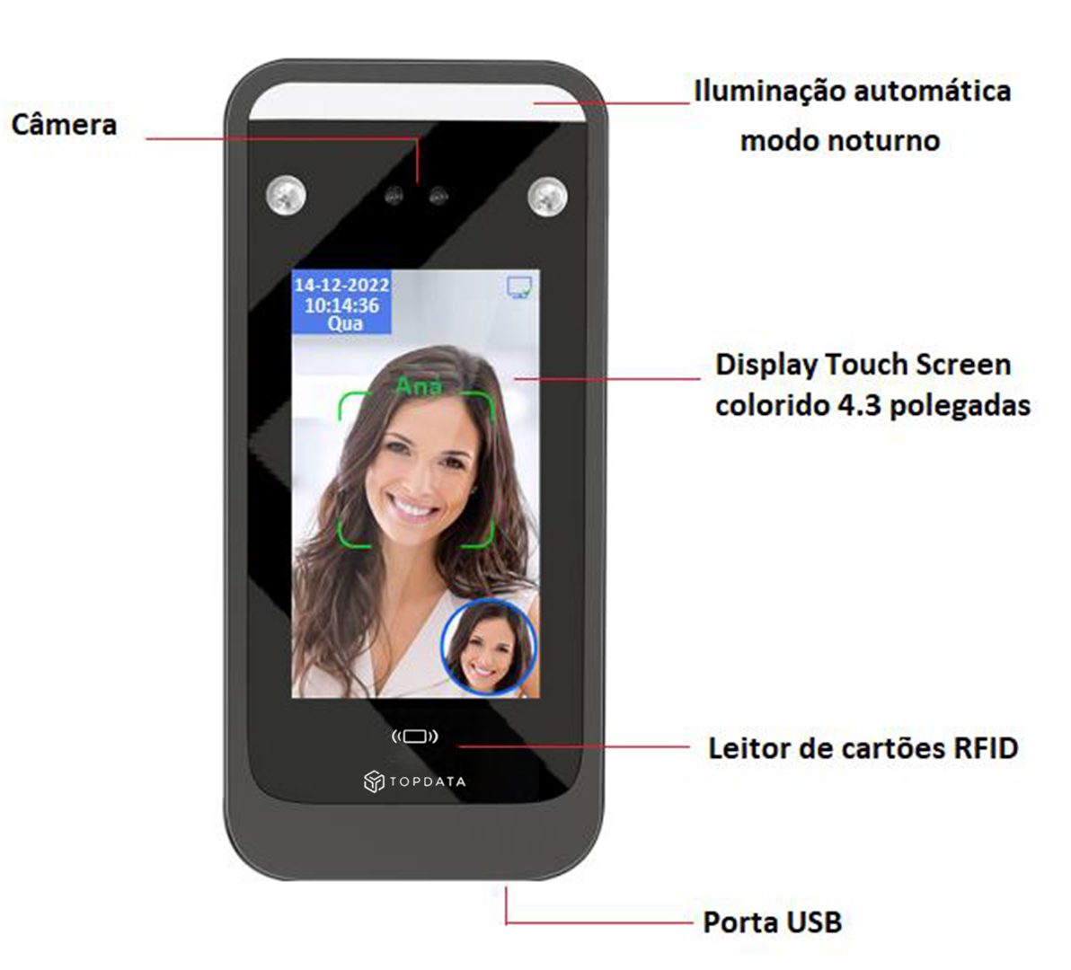 O Leitor Facial Topdata oferece três modos de identificação do usuário: facial, cartão ou senha.