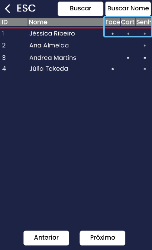 Permite visualizar os cadastros existentes e realizar alterações dos dados individuais (como ID, Nome, Face, Cartão, Senha e Tipo de permissão)
