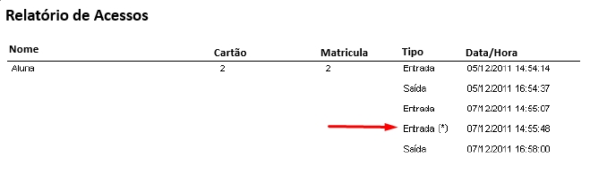 Caso o sistema caia para off-line e ocorra algum acesso no período, esses registros são exibidas com o símbolo de um asterisco entre parênteses (*) no relatório de Acessos.