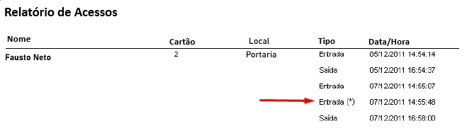 Caso o sistema caia para off-line e ocorra algum acesso no período, esses registros são exibidas com o símbolo de um asterisco entre parênteses (*) no relatório de Acessos.