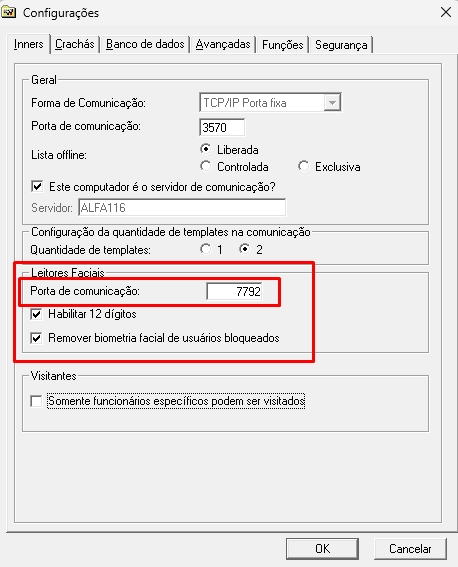 Para alterar a porta de comunicação dos Leitores Faciais no TopAcesso é necessário acessar o menu “Configurações” e na aba “Inners” vai ter a opção de Leitores Faciais onde é possível verificar a porta de comunicação do Leitor Facial e alterar se necessário: