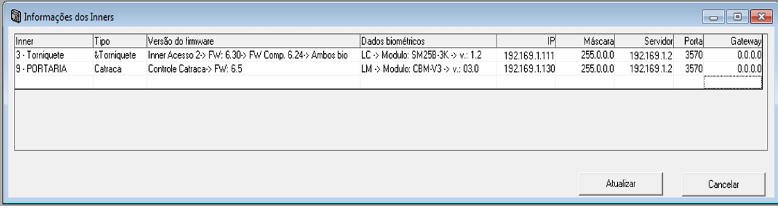 - Dados biométricos: Exibe o Tipo, modelo e versão do firmware do módulo biométrico que o Inner está utilizando.