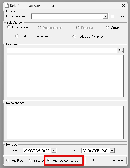 Para gerar o mesmo seria no menu “Relatórios> Acessos> Estatística > Acessos por local” onde no filtro é necessário selecionar a opção “Analítico com totais”: