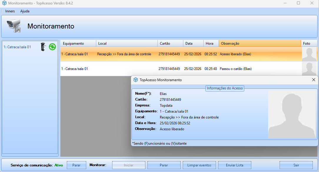 | 1 – Catraca/sala 01 | Fora da área de controle >> Recepção | 279181445449 | 23/02/2026 | 08:55:22 | Acesso liberado (Elias) | |