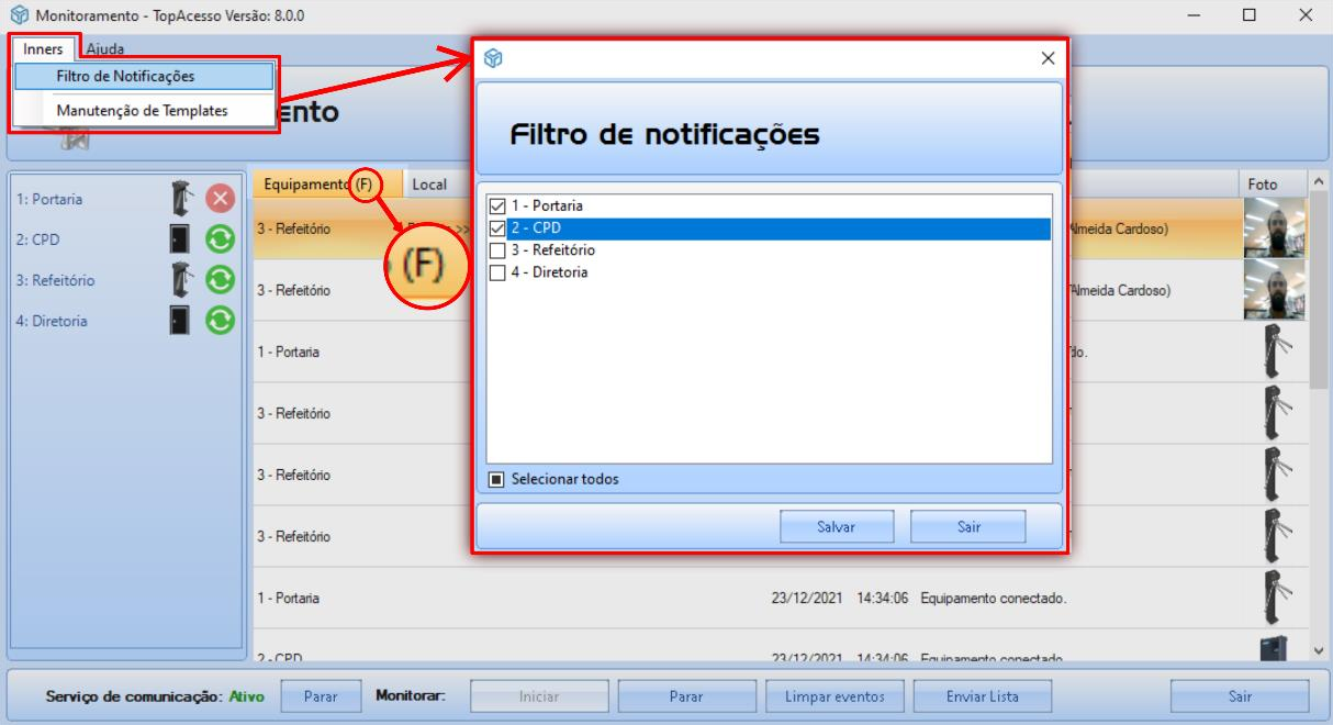 O Filtro de Notificações controla quais Inners (equipamentos) têm seus eventos exibidos no TopAcesso Monitoramento neste computador.