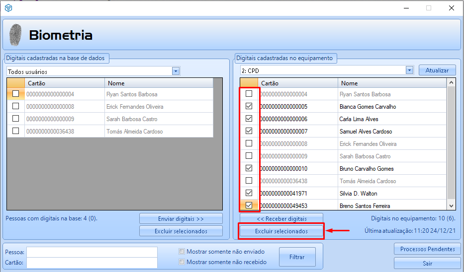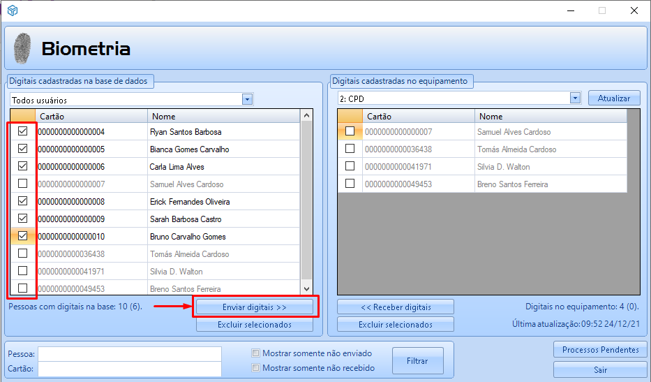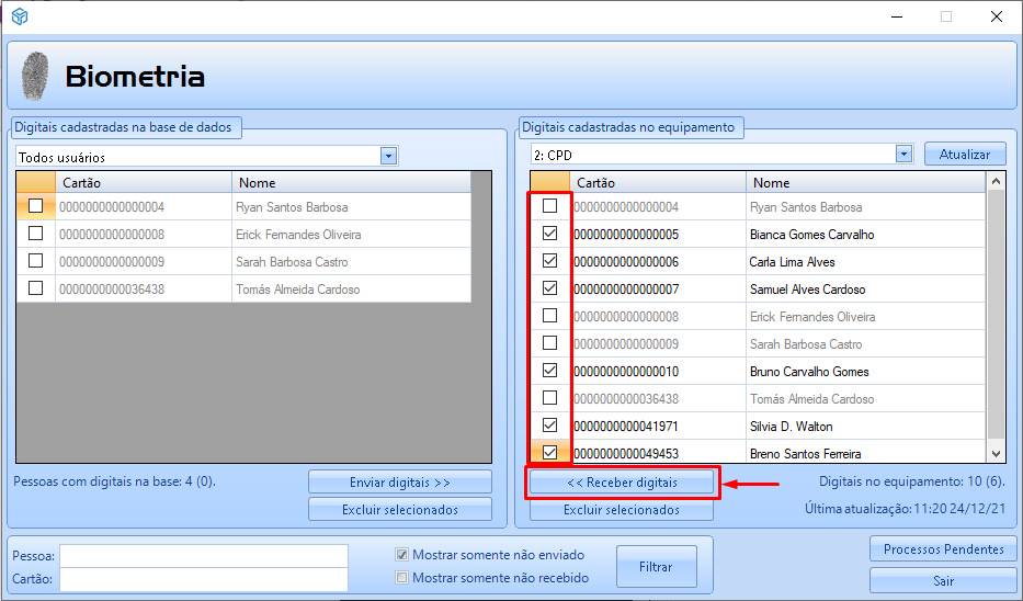 Selecione as pessoas cujas digitais devem ser recebidas do equipamento.